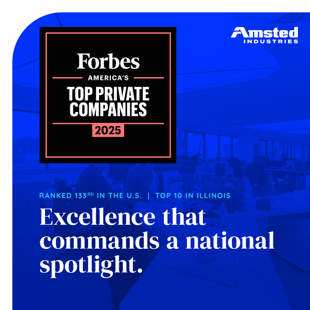 Amsted Industries is proud to announce we have been ranked 133rd on Forbes’ 40th Annual List of America’s Top Private Companies, recognizing the largest and most successful privately held companies in the United States. We are also honored to be 10th among companies headquartered in Illinois.